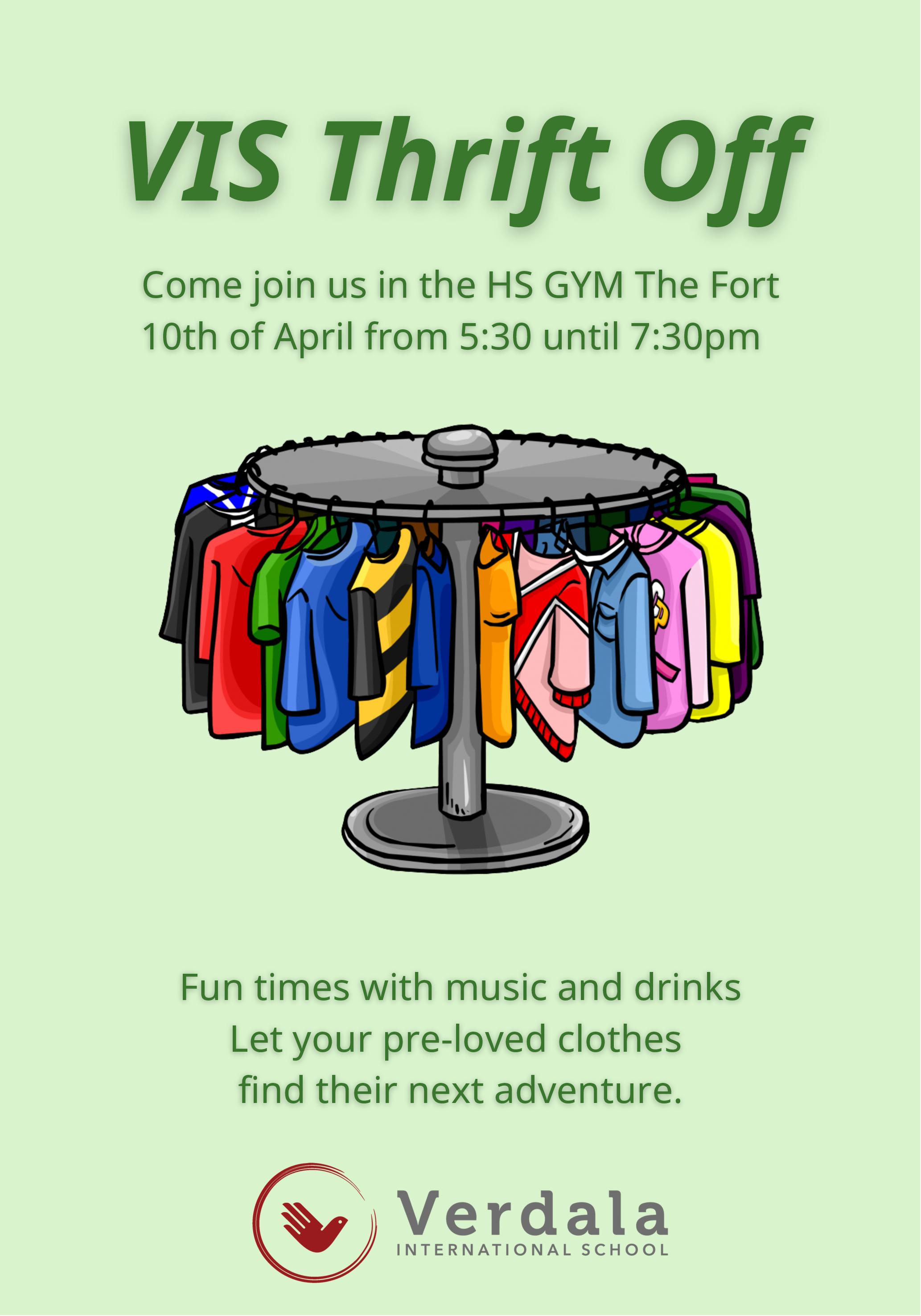 On the afternoon of the 10th of April, from 5:30 -7:30, VIS will be holding the Thrift-Off in the high school gym. This annual event provides our community with the opportunity to come together and shop sustainably, for free! Visit the Thrift-Off, and celebrate Earth Month by helping to reduce the waste created by fast fashion. Contact the eco committee to help out or to donate unwanted clothes.