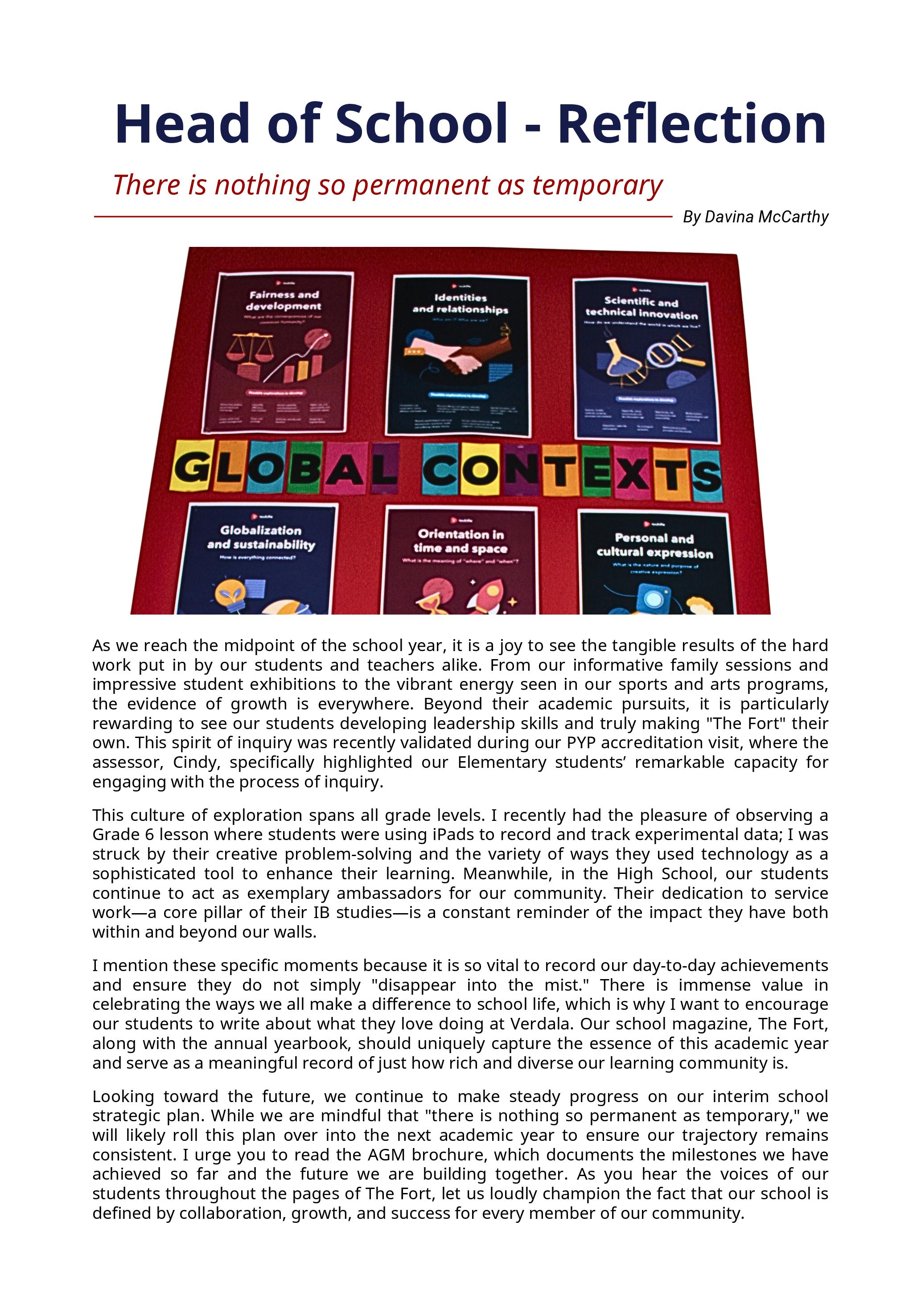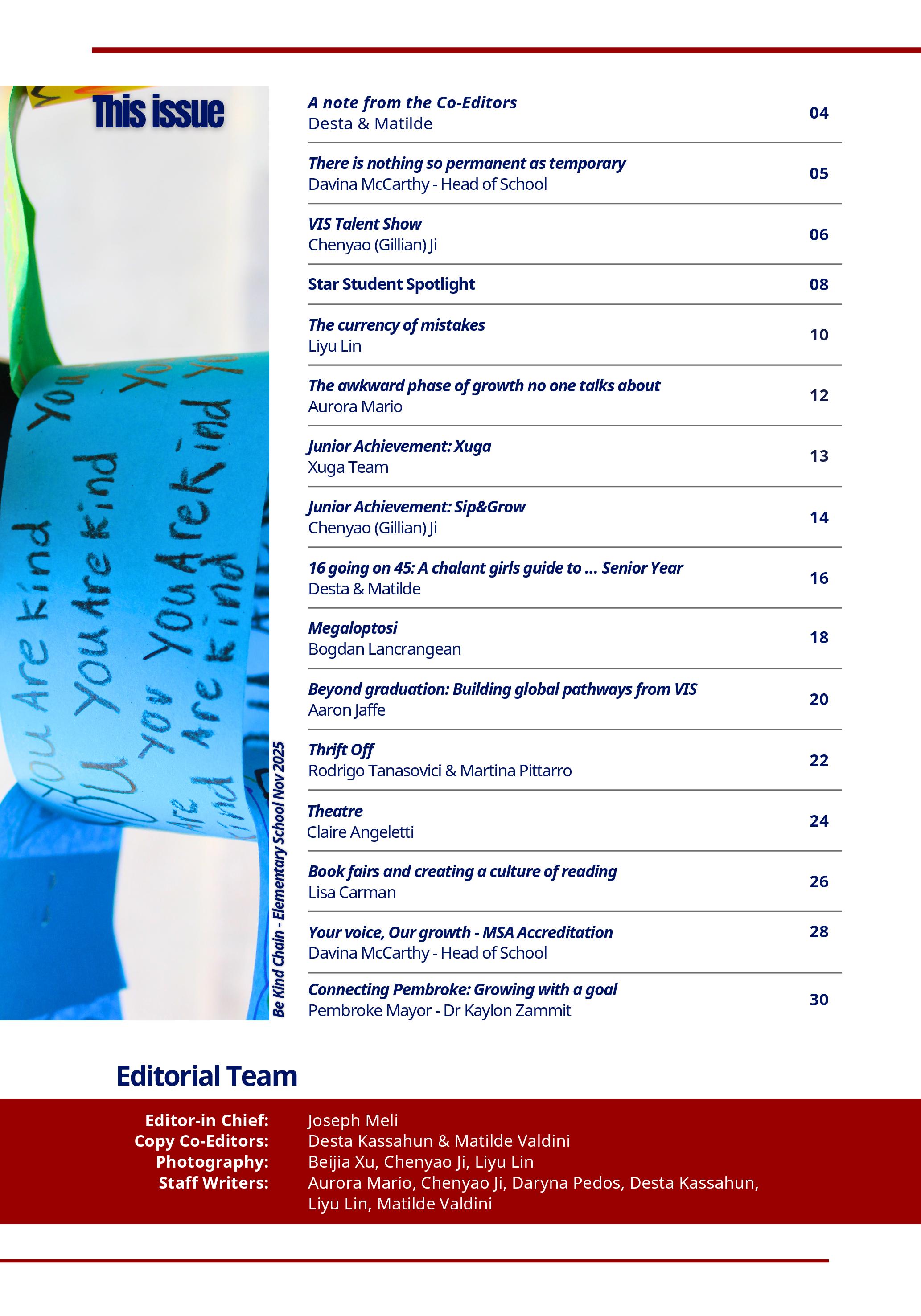 In this issue, we are proud to showcase a diverse collection of submissions from both students and staff. From thoughtful reflections and creative writing to artwork, photography, and insightful articles, each piece reflects the unique perspectives and talents that make our school such a dynamic place to learn and grow.