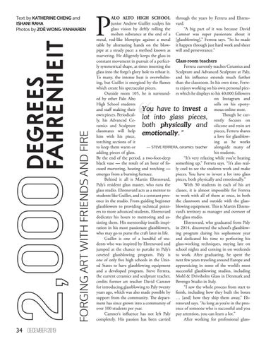 ALO ALTO HIGH SCHOOL through the years by Ferrera and Ehrensjunior Andrew Guillet sculpts his vard. glass vision by deftly rolling the “A big part of it was because David molten substance at the end of a Camner was super passionate about it metal, rod-like blowpipe against a metal [glassblowing],” Ferrera says. “So he made table by alternating hands on the blow- it happen through just hard work and sheer pipe at a steady pace: a method known as will and perseverance.” marvering. He diligently keeps the glass in constant movement in pursuit of a perfect- Glass-room teachers ly symmetrical shape, at times inserting the Ferrera currently teaches Ceramics and glass into the forge’s glory hole to reheat it. Sculpture and Advanced Sculpture at Paly, To many, the intense heat is overwhelm- and his influence extends much farther ing, but Guillet is energized by the flames than the classroom. In his own time, Ferrewhich create his spectacular pieces. ra enjoys working on his own personal piecOutside room 105, he is surround- es which he displays to his 40,000 followers ed by other Palo Alto on Instagram and High School students sells on his eponyand staff making their You have to invest a mous online store. own pieces. Periodicalhe curlot into glass pieces, rentlyThough ly, his Advanced Cefocuses on ramics and Sculpture both physically and silicone and resin art classmates will help pieces, Ferrera shares emotionally. ” him with his piece, a love for glassblowtorching sections of it ing as he works to keep them warm or alongside many of — STEVE FERRERA, ceramics teacher adding pieces of glass. his students. By the end of the period, a two-foot-deep “It’s very relaxing while you’re heating black vase — the result of an hour of fo- something up,” Ferrera says. “It’s also realcused marvering, heating and torching — ly cool to see the students work and make emerges from a burning furnace. pieces. You have to invest a lot into glass Behind it all is Martin Ehrensvard, pieces, both physically and emotionally.” Paly’s resident glass master, who runs the With 30 students in each of his art glass studio. Ehrensvard acts as a mentor to classes, it is almost impossible for Ferrera students like Guillet, and is a constant pres- to work with all of them at once, in both ence in the studio. From guiding beginner the classroom and outside with the glassglassblowers to providing technical point- blowing equipment. This is Martin Ehrensers to more advanced students, Ehrensvard vard’s territory as manager and overseer of dedicates his hours to mentoring and as- the glass studio. sisting them. His mentorship instills inspiEhrensvard, who graduated from Paly ration in his most passionate glassblowers, in 2014, discovered the school’s glassblowwho may go to purse the craft later in life. ing program during his sophomore year Guillet is one of a handful of stu- and dedicated his time to perfecting his dents who was inspired by Ehrensvard and glass-working techniques, staying late on jumped at the chance to partake in Paly’s school nights and coming in on weekends coveted glassblowing program. Paly is to work. After graduating, he spent the one of only five high schools in the Unit- next few years traveling around Europe and ed States to have glassblowing equipment apprenticing in some of the world’s most and a developed program. Steve Ferrera, successful glassblowing studios, including the current ceramics and sculpture teacher, Mohl & Drivsholm Glass in Denmark and credits former art teacher David Camner Berengo Studio in Italy. for introducing glassblowing to Paly twenty “I saw the whole process from start to years ago, which was also made possible by finish, including how they built the boxes support from the community. The depart- … [and] how they ship them away,” Ehment has since grown into a community of rensvard says. “As long as you’re in the presover 100 students per year. ence of someone who is successful and you Camner’s influence has not left Paly pay attention, you can learn a lot.” completely. His passion has been carried After working for professional glass-