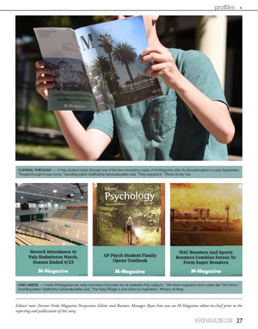 ONE-LINERS — Inside M-Magazine are witty one-liners that poke fun at relatable Paly subjects. “We drew inspiration from satire like The Onion,” founding editor Siddhartha Sahasrabuddhe said. “The Daily Pillage is also listed as inspiration.” Photos: M-Mag