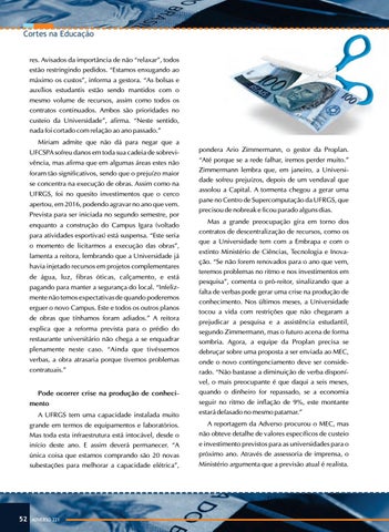 Cortes na Educação res. Avisados da importância de não “relaxar”, todos estão restringindo pedidos. “Estamos enxugando ao máximo os custos”, informa a gestora. “As bolsas e auxílios estudantis estão sendo mantidos com o mesmo volume de recursos, assim como todos os contratos continuados. Ambos são prioridades no custeio da Universidade”, afirma. “Neste sentido, nada foi cortado com relação ao ano passado.” Miriam admite que não dá para negar que a UFCSPA sofreu danos em toda sua cadeia de sobrevivência, mas afirma que em algumas áreas estes não foram tão significativos, sendo que o prejuízo maior se concentra na execução de obras. Assim como na UFRGS, foi no quesito investimentos que o cerco apertou, em 2016, podendo agravar no ano que vem. Prevista para ser iniciada no segundo semestre, por enquanto a construção do Campus Igara (voltado para atividades esportivas) está suspensa. “Este seria o momento de licitarmos a execução das obras”, lamenta a reitora, lembrando que a Universidade já havia injetado recursos em projetos complementares de água, luz, fibras óticas, calçamento, e está pagando para manter a segurança do local. “Infelizmente não temos expectativas de quando poderemos erguer o novo Campus. Este e todos os outros planos de obras que tínhamos foram adiados.” A reitora explica que a reforma prevista para o prédio do restaurante universitário não chega a se enquadrar plenamente neste caso. “Ainda que tivéssemos verbas, a obra atrasaria porque tivemos problemas contratuais.” Pode ocorrer crise na produção de conhecimento A UFRGS tem uma capacidade instalada muito grande em termos de equipamentos e laboratórios. Mas toda esta infraestrutura está intocável, desde o início deste ano. E assim deverá permanecer. “A única coisa que estamos comprando são 20 novas subestações para melhorar a capacidade elétrica”,