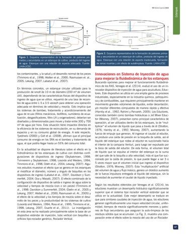 Innovaciones en Sistema de Inyección de agua para mejorar la fluidodinámica de los estanques Buscando opciones para mejorar el funcionamiento fluidodinámico de los RAS, Venegas et al. (2014), evaluó el uso de un innovador dispositivo de inyección de agua para acuicultura, Eductores. Este dispositivo se utiliza en una amplia gama de procesos industriales, especialmente en la industria química, petroquímica y de combustibles, que requieren principalmente mantener en movimiento grandes volúmenes de líquidos, evitar decantación, y/o mezclar diferentes compuestos de manera rápida y efectiva (Harnby et al., 1992; Rahimi y Parvareh, 2005). Los Eductores, conocidos también como bombas hidráulicas o Jet Mixer Eductor (Mooney, 2007), presentan como principal característica de operación, al ser utilizados dentro de los estanques, la de “multiplicar” el volumen de líquido que pasa a través de él (Stratton, 1976; Harnby et al., 1992; Mooney, 2007), aumentando la fuerza de empuje que generan. Al ingresar el caudal al eductor, se produce una caída de presión en la boquilla de salida, así el líquido del estanque que rodea al eductor es succionado hacia el interior de la campana Venturi, para luego ser expulsado por la boca de salida del eductor. De esta forma, el volumen total de líquido que se expulsa al interior del estanque es la suma del que sale de la boquilla a alta velocidad, más el que fue succionado por la caída de presión, lo que puede llegar a ser 3 o 5 veces mayor que el volumen inicial que ingreso al dispositivo (Stratton, 1976; Mooney, 2007). Esta “multiplicación” artificial del volumen de agua y flujo másico, genera un drástico aumento de la fuerza impulsora entregada al líquido del estanque, sin la necesidad de aumentar el caudal de líquido inyectado. Según los resultados obtenidos por Venegas et al. (2014), los eductores muestran un desempeño hidráulico significativamente superior que el sistema tipo rociador vertical estándar que se utiliza en la actualidad. Este mejor desempeño se traduce en que para similares caudales de inyección de agua, los eductores generan significativamente una mayor velocidad circular, uniformidad, tiempos de mezcla significativamente menores y patrones de flujo secundarios que aseguran la auto-limpieza de los residuos sólidos que se acumulan. La Fig. 3, muestra una comparación entre el efecto sobre la mezcla del uso de un Rociador 87