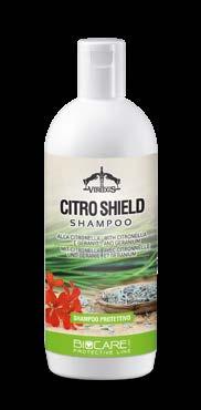 Citro Shield Shampoo associa l’azione detergente e nutritiva alle proprietà protettive della citronella e del geranio. Per rafforzare l’azione usare Citro Shield Spray.