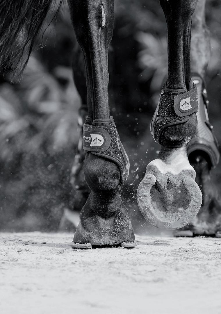 Le carbone combiné à un film de gel assure une protection optimum tandis que la double ventilation permet l’évacuation de la chaleur qui se dégage du membre du cheval pendant le travail: l’air dégagé traverse la couche en néoprène microperforé et se distribue ensuite dans le tissu 3D mesh ventilé.