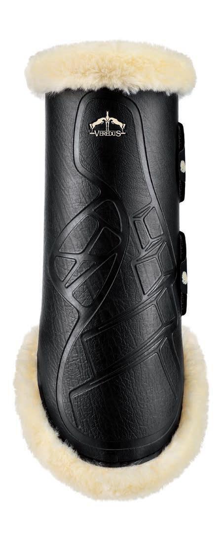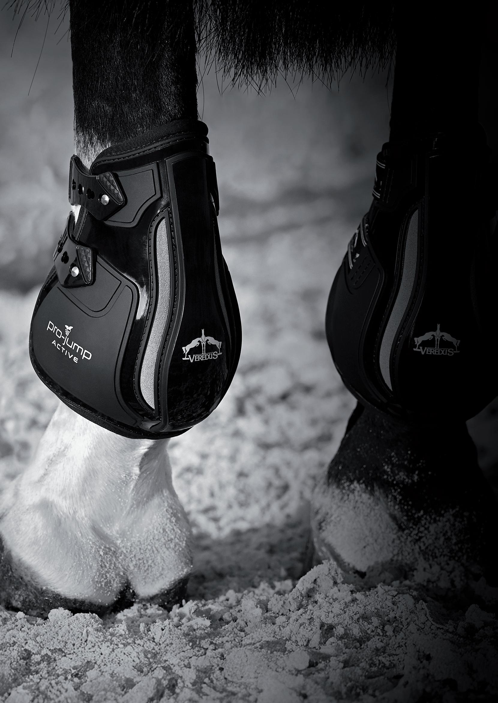 Dank der von Veredus für diese Linie von Streichkappen erdachten Form und Materialien finden die Pferde hier eine wertvolle Unterstützung, um die Hinterbeine während des Sprunges richtig anzubeugen und zu bewegen.