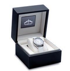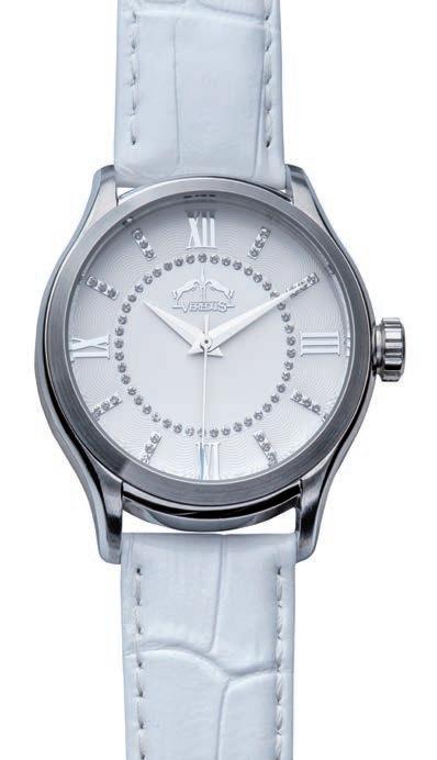 Edelstahlgehäuse 39 mm - weißes Ziffernblatt mit Steinen. Armband aus weißem Leder. Schweizer Uhrwerk.