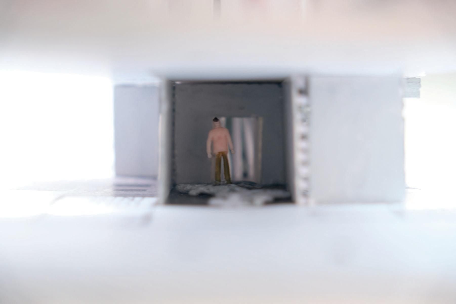 A half-length stone installation extending from the ceiling to the floor. When the visitor walks into the passage, others will see him disappear from the upper body, to the lower body, and to the disappearance of the feet. Increased interactivity between participants and accentuated the feeling of stepping into the depths of the cave.