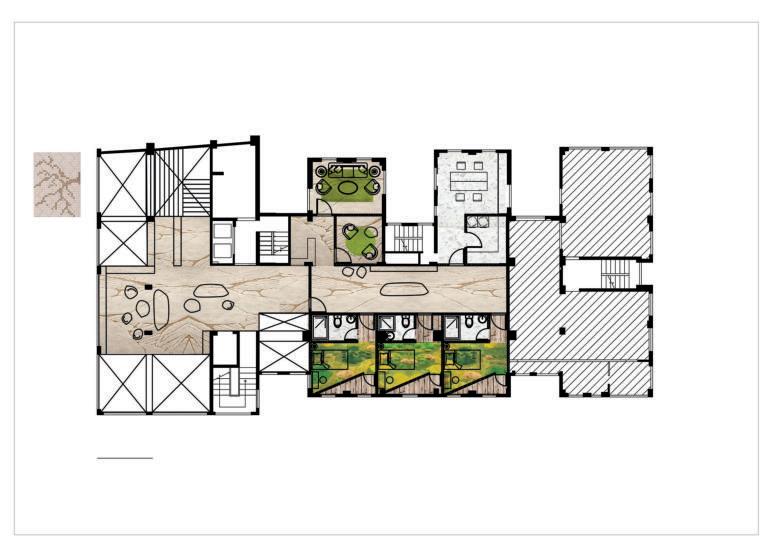 There are long tables in the public space, the floor is raised on both sides of the space, and a sofa seat is designed to sink into. In this public space, there is an opportunity to facilitate communication between people. In addition, many books on self-healing are placed in the public space. Some mind-body-spirit classes can also be held here.