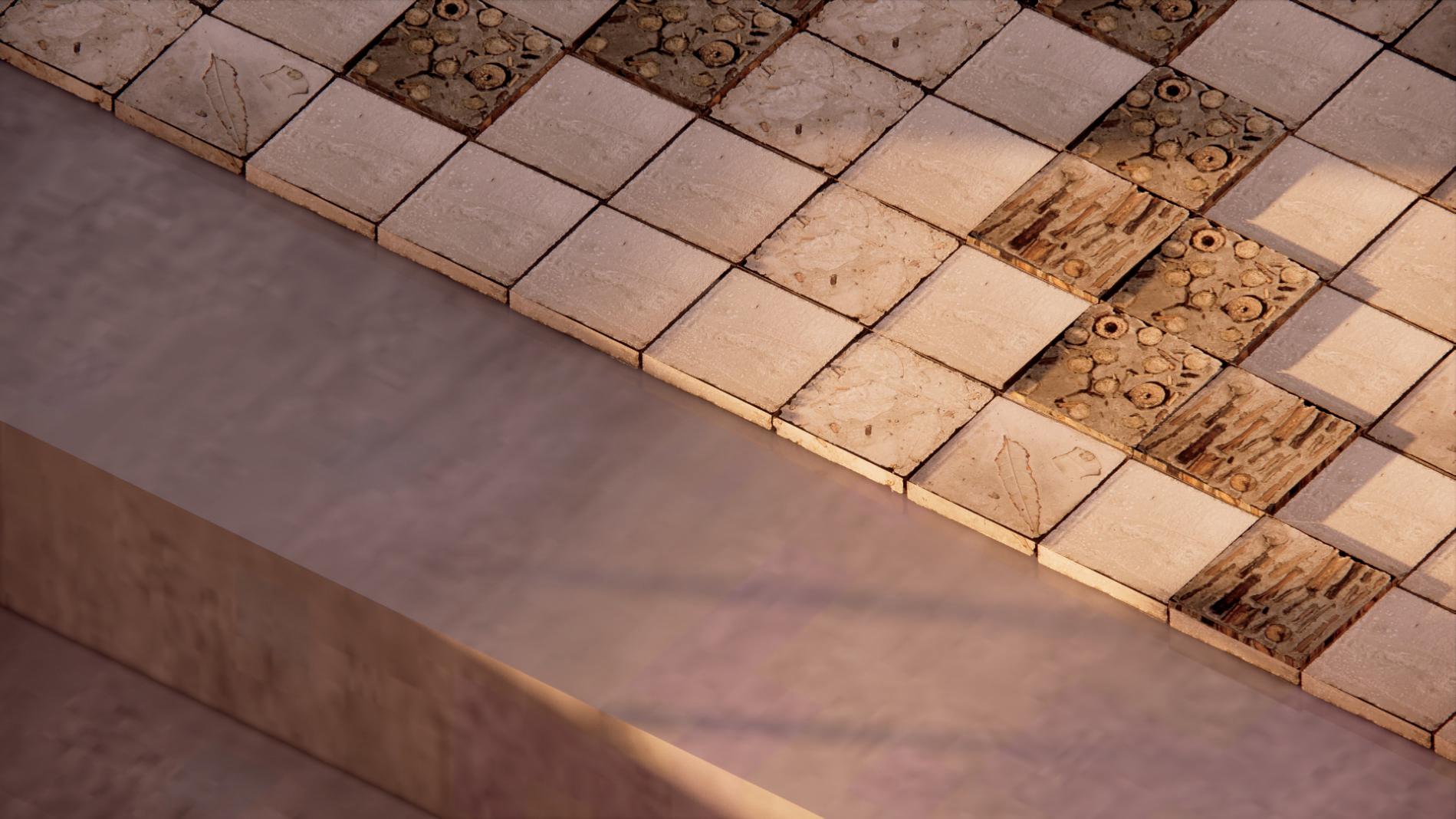 In the form of mosaics, the pattern of roots growing in the soil is spelled out, echoing the concept of "seed growth".