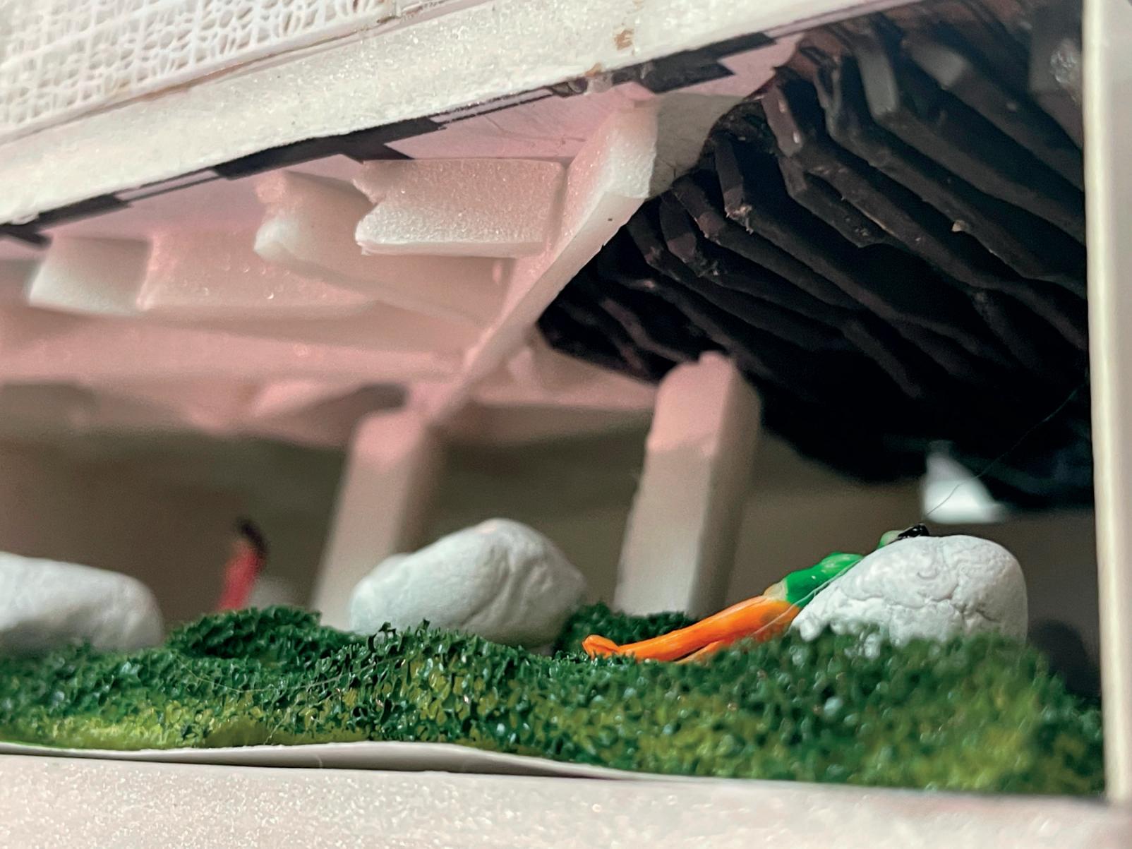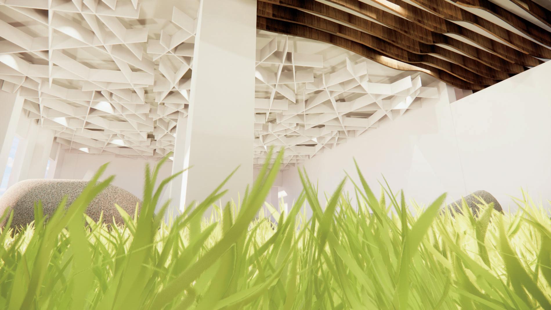 Entering the lounge, the space suddenly becomes vast, just as a seed breaks through the soil and sees the sky. Here, participants can rest, relax and enjoy the tranquility on the undulating imitation grass at will. In the front part of the room, you can see the extension of the ceiling installation of Struggle Room, which represents the link between things.The ceiling on the other side uses leaf patterns, which represent growth. In this space, soft music and aromatherapy will be played to help