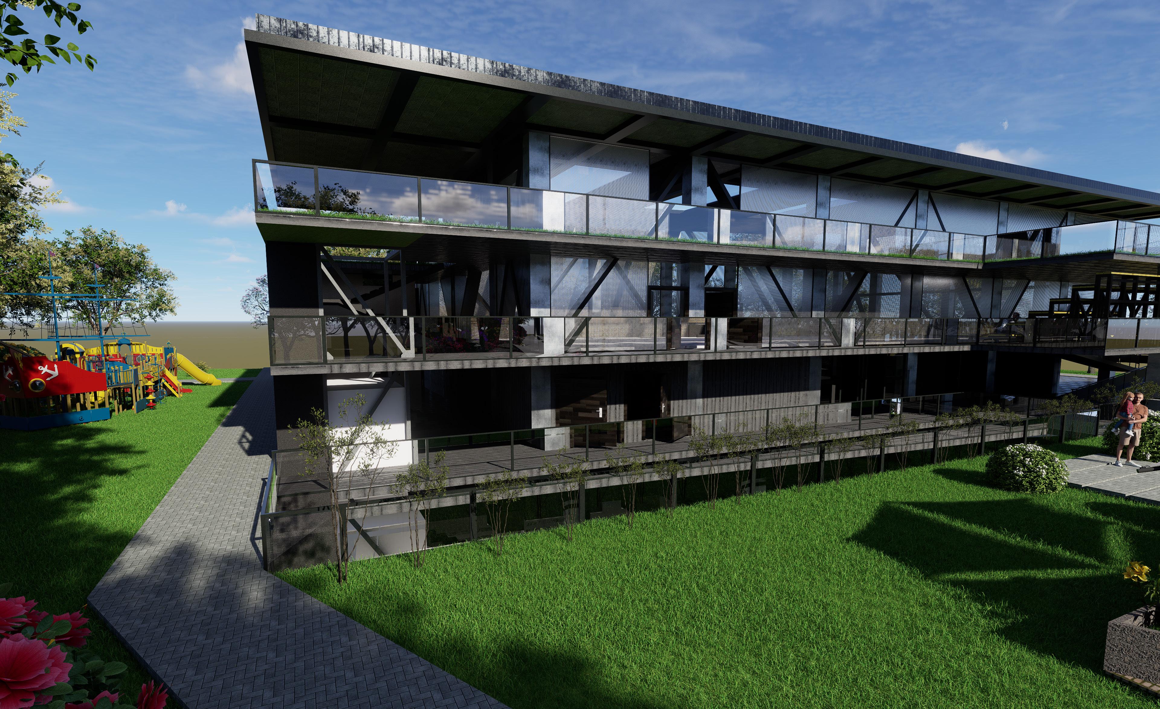 El edificio incluye una zona de parqueo privado subterráneo, un nivel comercial con tres locales, un nivel de amenidades privadas (terraza y parque internos), y cinco plantas de apartamentos que van de los 70 m² a los 120 m². Cada espacio está pensado para responder tanto a las necesidades funcionales de los residentes como a las dinámicas urbanas del entorno. Los locales comerciales ayudan a dinamizar la calle y aportan seguridad y vida en planta baja. La terraza y el parque interno sirven como zonas de encuentro y descanso, fomentando la convivencia entre vecinos. En conjunto, el proyecto busca crear una conexión más real entre la arquitectura y las personas.