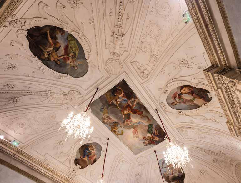 c) Listed as a historical monument in 1977, it underwent extensive restoration that took till the late 1990s. Since 2013, the property has belonged to the investor René Benko. It boasts a veritable treasure trove of frescoes by the rococo artist Carl Henrici. In the hall of honour and the adjoining chinoiserie living room, the large-scale murals are a marvel. Dating from 1776, they were commissioned by the wealthy patrician Menz family, on the occasion of a family wedding. The large frescoes on the 2nd floor depict scenes of elegant frivolity including Venetian masked balls, seduction and the Orient.