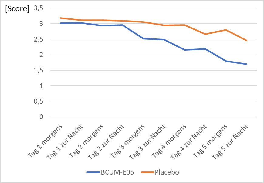 Das Ziel der vorliegenden Auswertung war daher, für BCUM-E05® den Verlauf des BSS in den ersten Tagen hinreichend genau zu beschreiben und auf eine mögliche Überlegenheit zu Placebo hin zu prüfen.