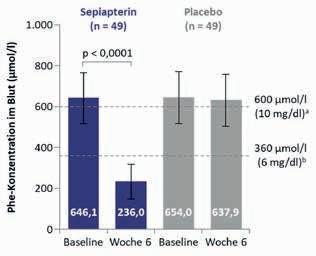 • Senkung des Phe-Wertes im Blut um durchschnittlich 410 μmol / l (~ 7 mg / dl) / 63 % ggü. Placeboa,2
