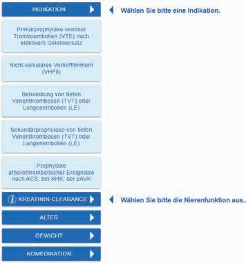 den eingebetteten CHA2DS2-VAScScore- bzw. HAS-BLED-ScoreRechner bestimmt werden. Über ein separates Nierenmodul lässt sich die individuelle Nierenfunktion einschätzen. Durch Angabe der Begleitmedikation kann man mit der App auch relevante Arzneimittelinteraktionen und Kontraindikationen der jeweiligen Produkte prüfen sowie Informationen zu wirtschaftlichen Rahmenbedingungen (Tagestherapiekosten, Nutzenbewertung) aufrufen.