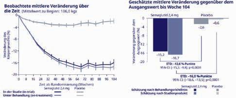 Eine Langzeitbehandlung über 104 Wochen führte zu einer mittleren Veränderung des Körpergewichts von –15,2 % in der SemaglutidGruppe gegenüber –2,6 % unter Placebo (Abb. 1), was einem geschätzten Behandlungsunterschied von –12,6 % entspricht (95%-KI –15,3 bis –9,8; p < 0,0001).