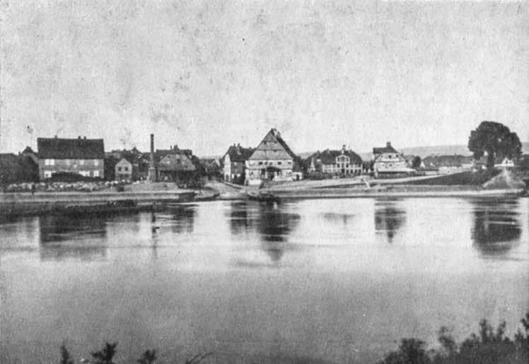 Holzminden um 1880: Das Foto oben und die Lithographie unten zeigen die Stadt Holzminden vor dem Bau der Weserbrücke. Auf der Lithografie befindet sich im Vordergrund die Brücke über das Hafenbecken, dahinter lagern Sollingsandsteinplatten für die Verschiffung. Der Handel mit Sollingsandsteinen, vor allem geschliffenen Platten für Fußböden und Dacheindeckungen lag weitgehend in der Hand der Familie Haarmann. Als Sohn dieser Familie wurde Wilhelm Haarmann 1847 in dem Haus rechts am Bildrand geboren.