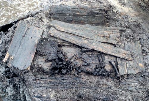 Säuglingsbestattung im römischen Eschenz, Kanton Thurgau. Oben eine Aufnahme der Fundsituation und unten eine Rekonstruktion mit den originalen Holzschindeln. Amt für Archäologie Thurgau, archaeologie.tg.ch.