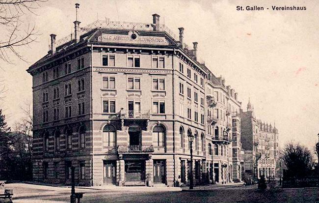 Diese Entstehungsgeschichte unterscheidet das St. Galler Volkshaus von anderen Volkshäusern, die direkt aus der Arbeiterbewegung hervorgingen oder, wie etwa in Zürich, gar nicht von dieser, sondern vom aufgeklärten Bürgertum initiiert wurden – einem Bürgertum, das sich genötigt sah, eine sich radikalisierende Opposition durch politisches Entgegenkommen zu neutralisieren. In St. Gallen war die Gründungsgeneration stolz auf das aus eigener Kraft, mit eigenen Handwerkern und Facharbeitern erschaffene Vereinshaus. Das mehrstöckige imposante Gebäude wirft ein Schlaglicht auf die Potenz des Arbeiterbildungsvereins, die heute noch staunenswert erscheint. Die Pioniere wollten zeigen, was sie konnten, und gingen dann mit vereinten Kräften ans Werk. Das Vereinshaus entstand in Rekordzeit, in Eigenregie und ohne finanzielle Hilfe vom Staat. Bis Mitte der 1980erJahre diente es den Gewerkschaften und der mit ihnen verbundenen Sozialdemokratie als gemeinsame Zentrale. In der Stadt galt es als das Haus der Roten. Der Bruch zwischen Gewerkschaften und SP aufgrund politischer Differenzen beendete diese Tradition, nicht aber die Existenz als Gewerkschaftszentrale. Heute, 125 Jahre nach seiner Errichtung, steht das Volkshaus immer noch da, beherbergt mit der Unia die grösste Gewerkschaft des Landes und wird von einer bald hundert Jahre alten Genossenschaft getragen. Das Volkshaus hat sich in dieser Zeit gewandelt – ein in Sandstein gehauenes Symbol der Solidarität ist es geblieben.