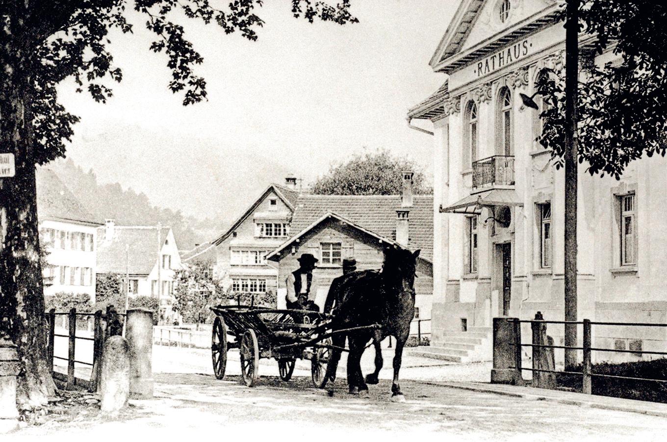 Ein Fuhrwerk vor dem Buchser Rathaus um 1918. Ross und Wagen werden für Transporte genutzt.