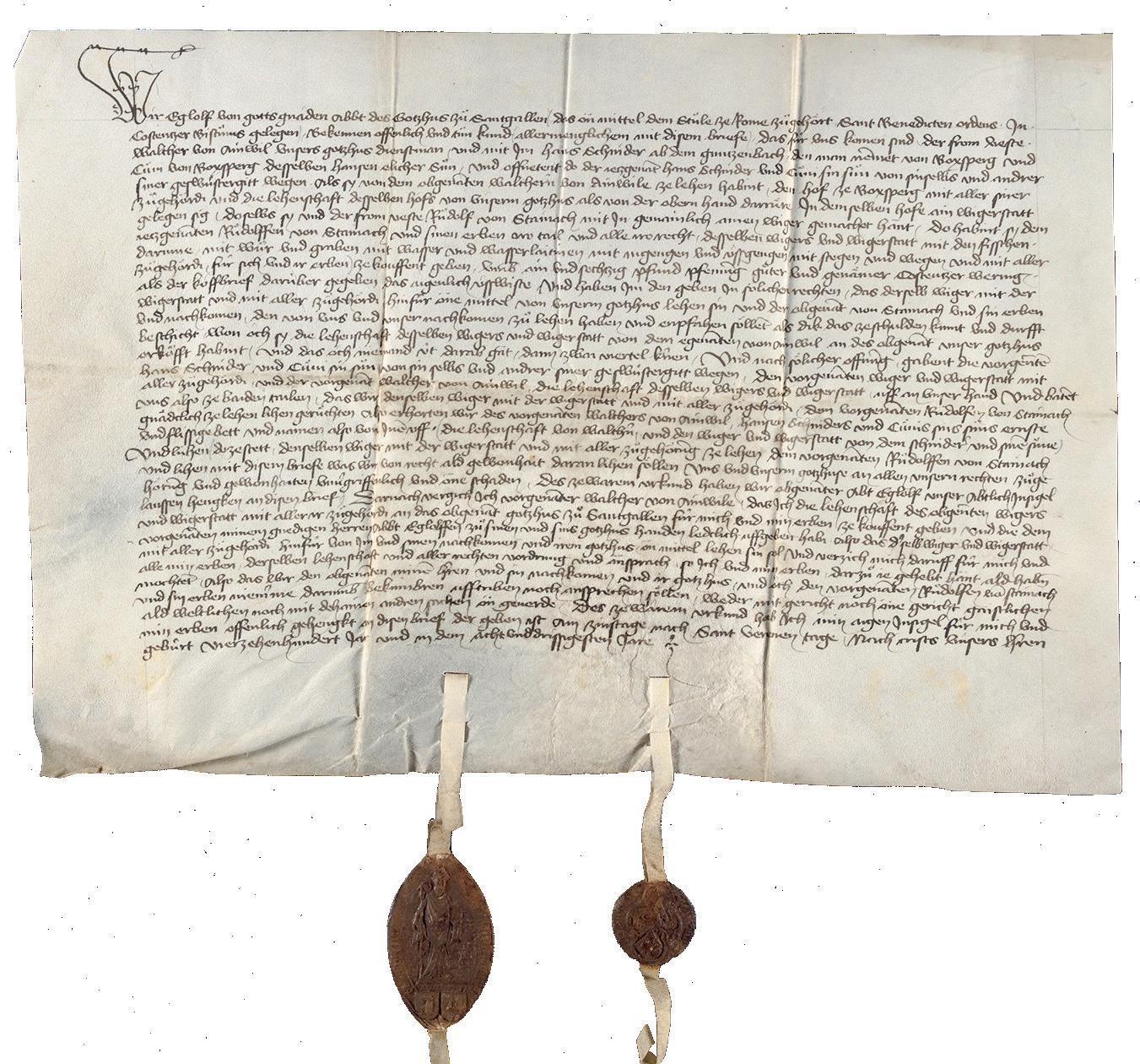 Lehensbrief von Abt Eglolf Blarer für Junker Rudolf von Steinach über den Weiher am Hof Botsberg, 2. September 1438. StiASG, Urk. MM1 G1.