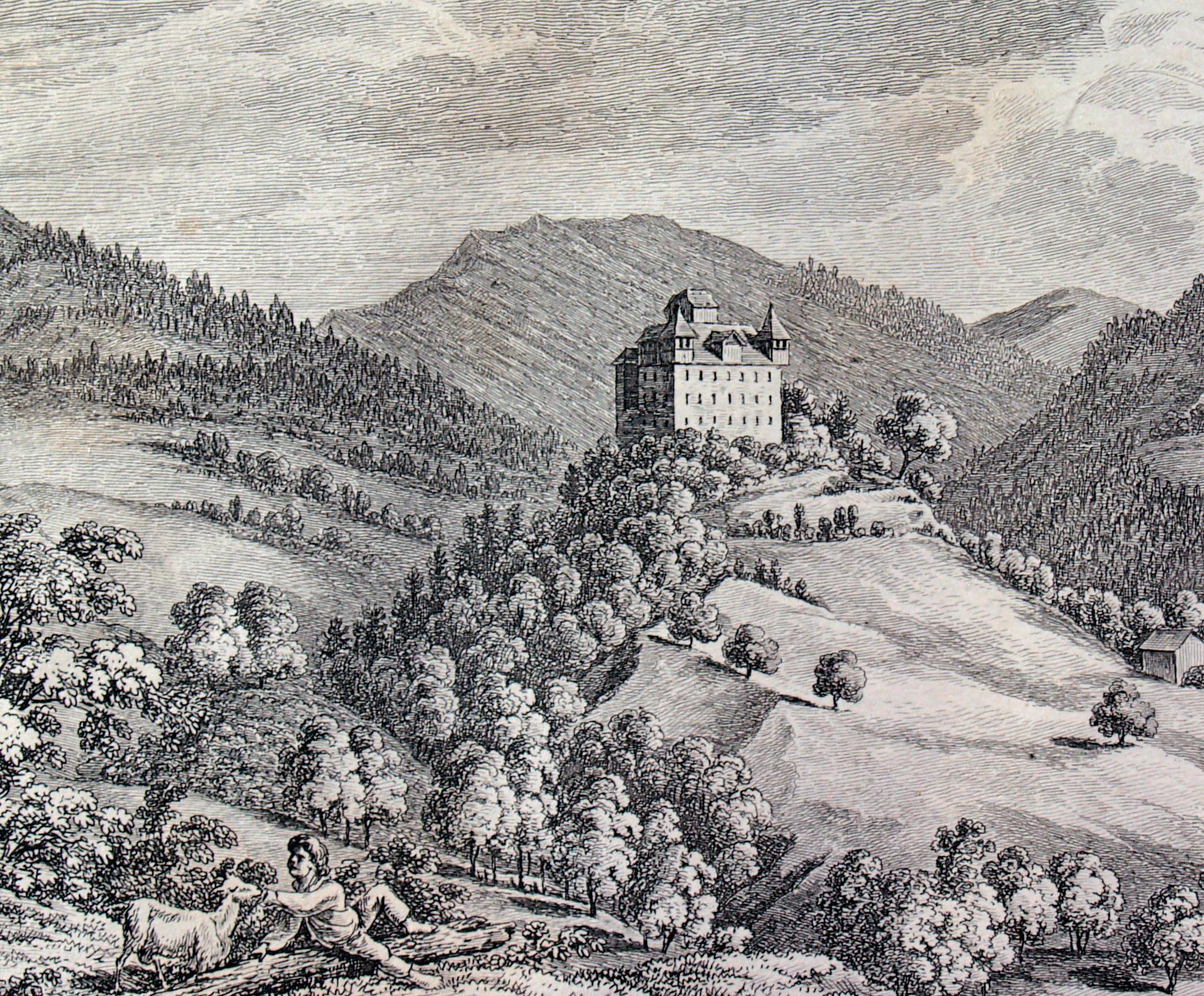 Südseite der Burg Iberg, Kupferstich von Salome Grob und Franz Hegi, um 1830. Toggenburger Museum.