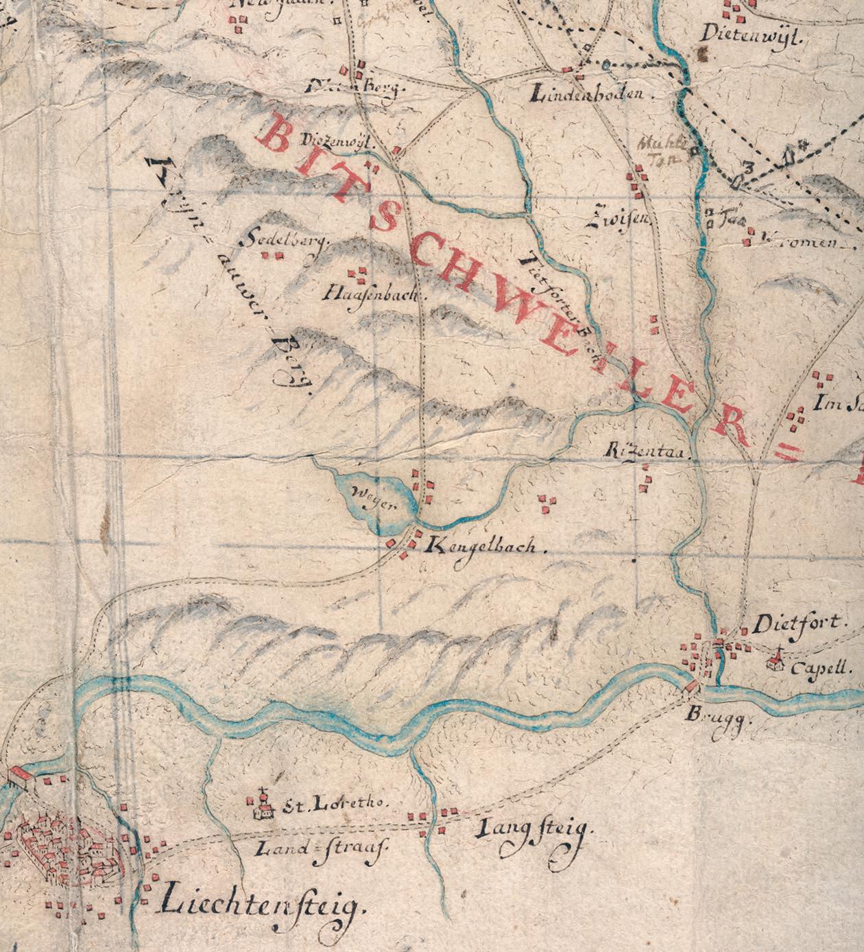 Weiher Kengelbach, Ausschnitt aus der Karte der Grafschaft Toggenburg von Johann Caspar Himmelberger, 1739. StiASG, Karten und Pläne, Nr. 28.