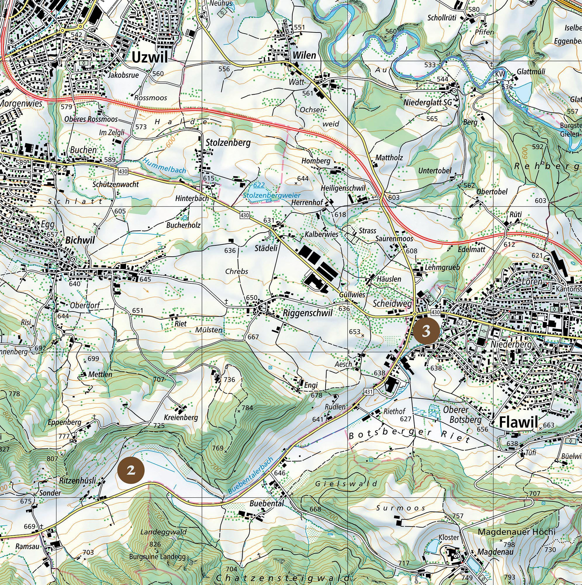 Wattwil: (A) Kloster St. Maria der Engel, erbaut 1621; (B) Vogtei Iberg; (C) Ruine Kloster Pfanneregg, ca. 1411–1620; (D) ungefährer Standort Beginenklause Hüenersedel, bis ca. 1411. Karte: Bundesamt für Landestopografie swisstopo.