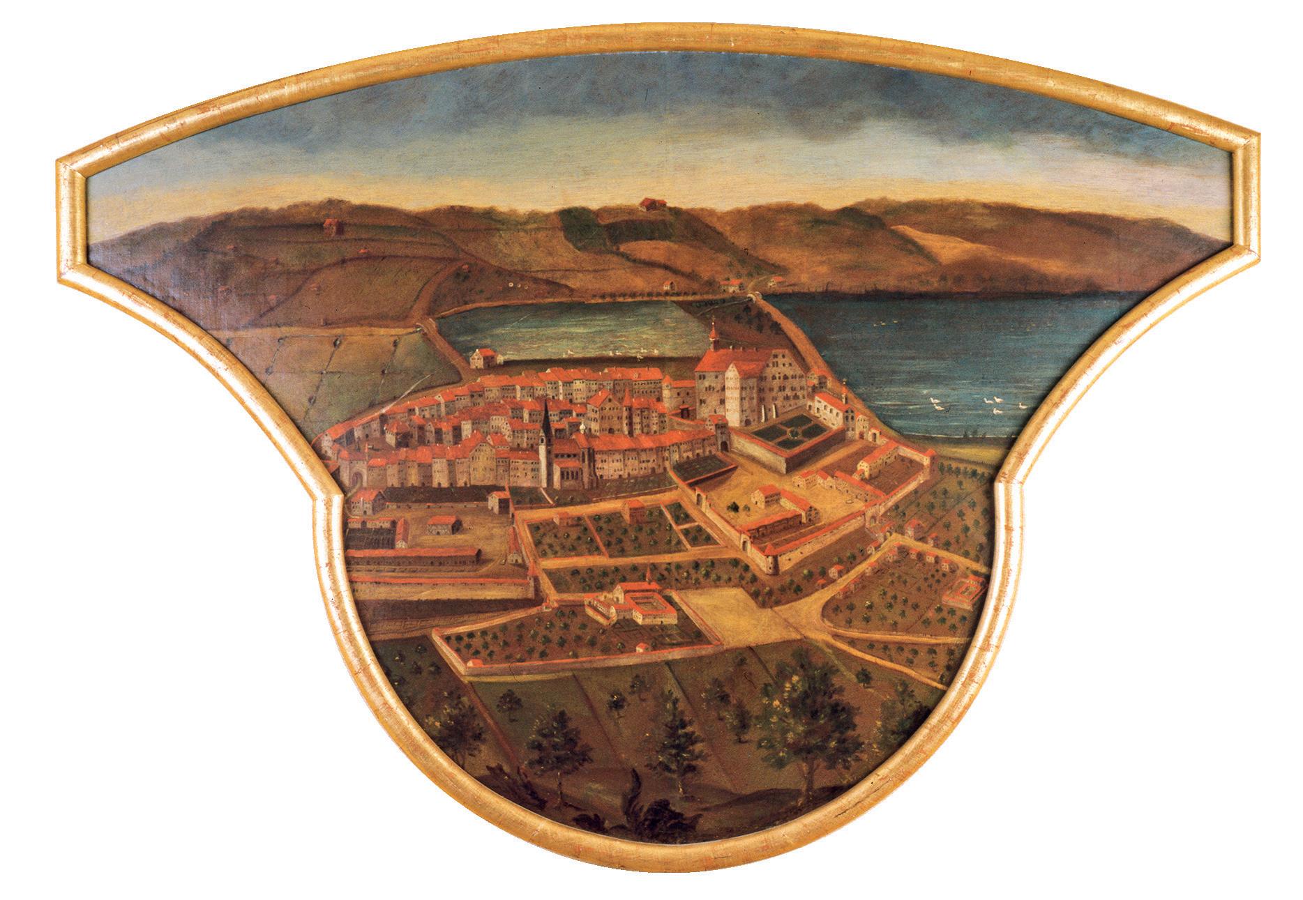 Stadtansicht von Wil um 1672 mit den zwei Weihern im Hintergrund. Gemälde auf Öl. Stadtmuseum Wil.