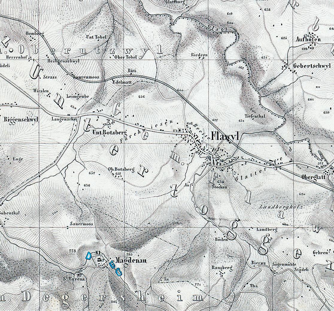 Auf der EschmannKarte (1854) ist der Weiher im Unteren Botsberg in verkleinerter Form noch eingezeichnet. Kartenausschnitt: StASG, KPH 4/005.