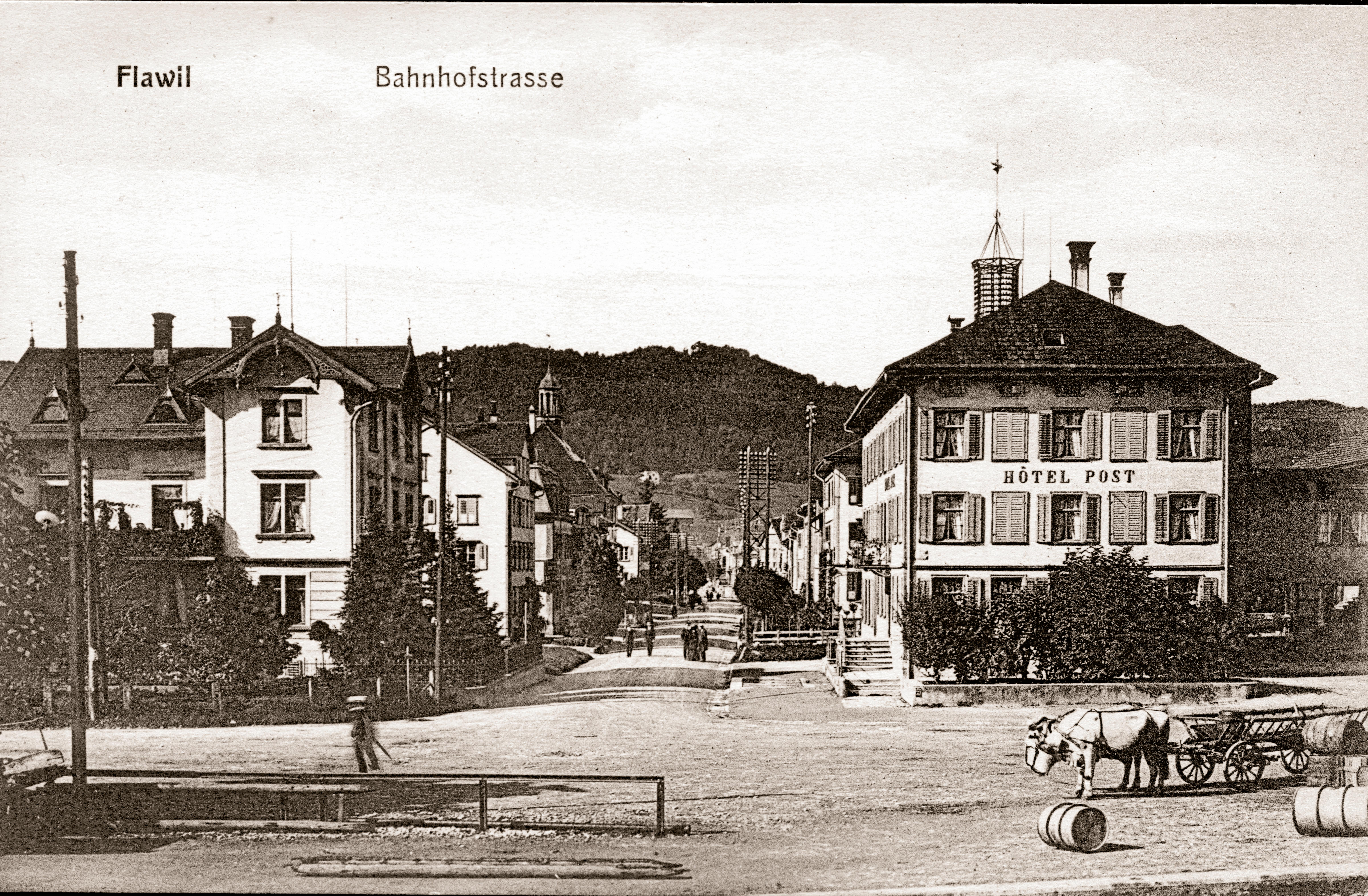 In Flawil war das Hotel Post Sitz der Telegrafenstation und der Telefonzentrale. Die vielen Leitungsabgänge auf dem Dach zeugen von wirtschaftlicher Aktivität im Bezirkshauptort des Untertoggenburgs.