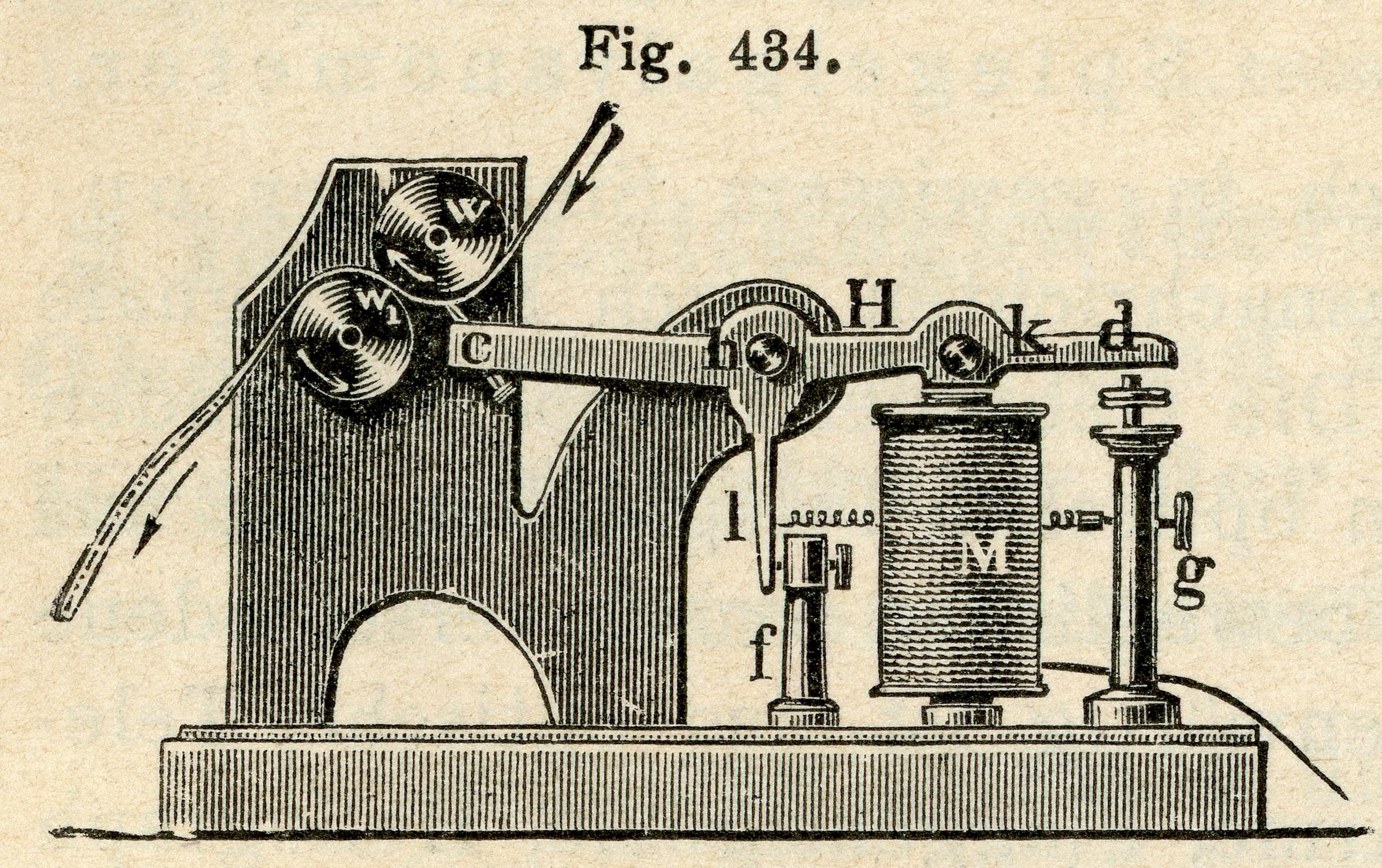 Zeichengeber Morsetaste und Zeichenempfänger Schreiber. Quelle: K. Sumpf 1910.