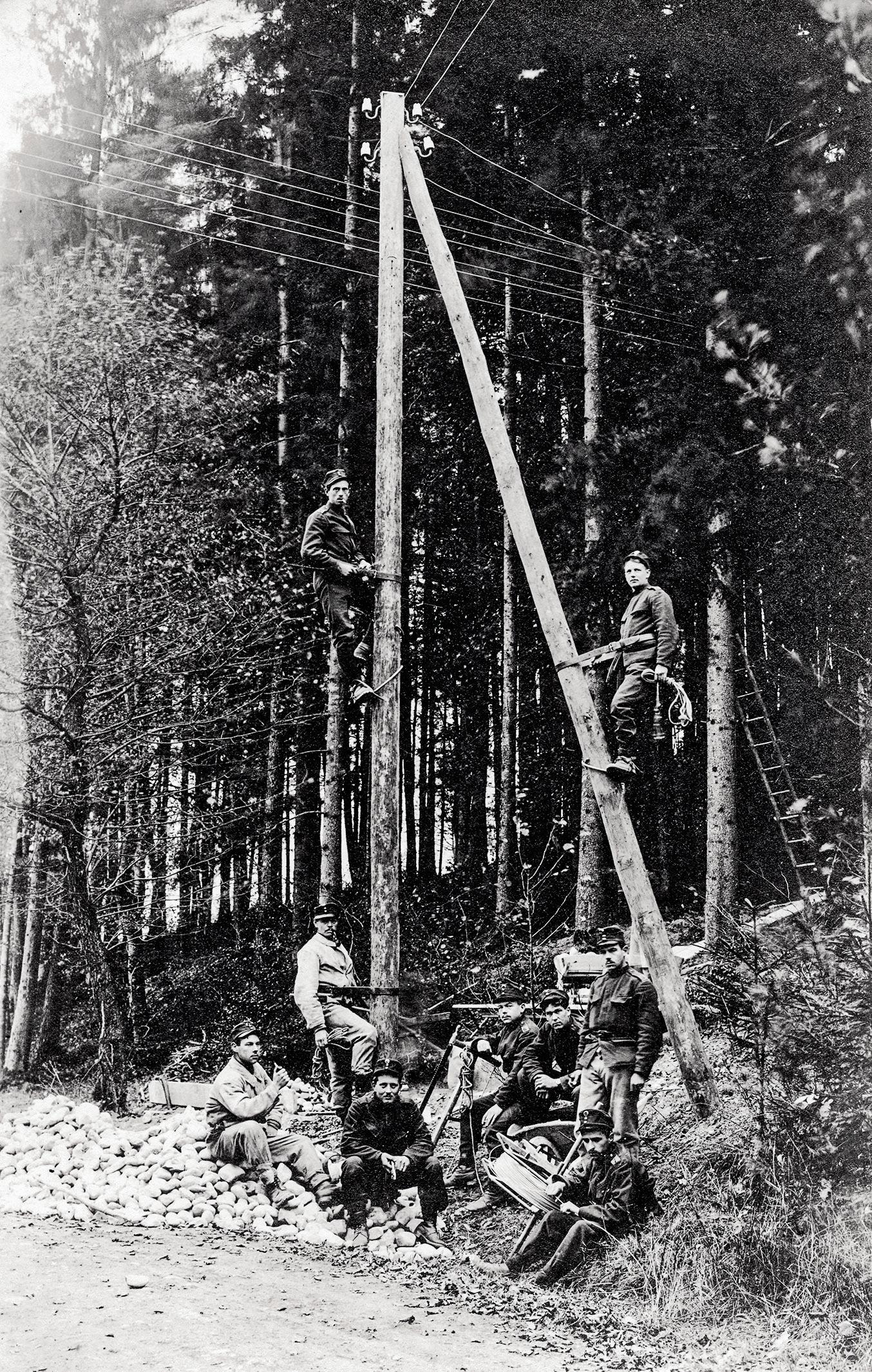 Telegrafenleitungen waren üblicherweise als Freileitungen ausgebildet. Das Bild von Telegrafenund Telefon-Pionieren der Armee aus den 1910er-Jahren vermittelt einen Eindruck von den Leitungen und der Arbeit in luftiger Höhe –im Pannenfall bei fast jeder Witterung und Tageszeit. Slg. A. Heer.