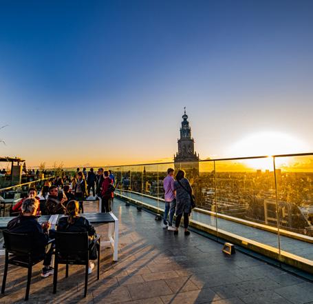 kleursamenstelling dan die bij de zee, dat is heel tof. Genieten van zo’n moment haalt je uit het gehaaste.” De rooftopbar van NOK is een unieke plek, een van de weinige rooftopterrassen in Europa met een 360-graden view. “Er is rondom glas, dat geeft een heel mondiaal gevoel. De skyline van Groningen wordt rood, oranje, roze en paars, met een wijds uitzicht over de weilanden en de stad. Dat is heel bijzonder. De muziek is heel toegankelijk; niet te hard, relaxed, en voor iedereen leuk. Studenten, toeristen, cultuursnuivers; iedereen is welkom! Je bent echt even weg van alle stadsgeluiden. Ik ken niemand die daar niet blij van wordt!”