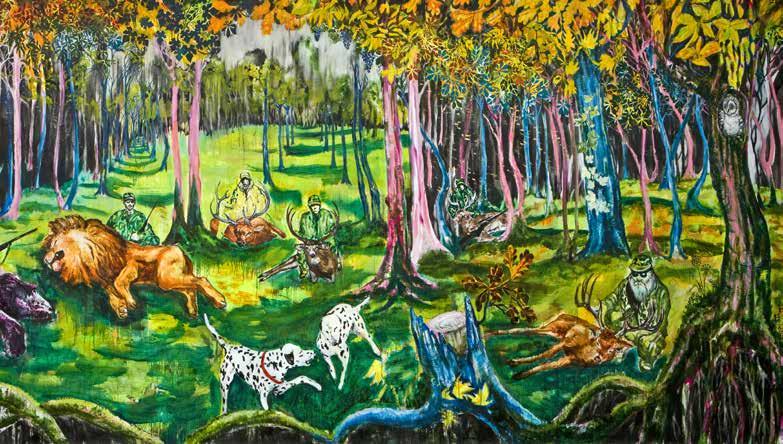 Jacht is bijvoorbeeld een thema dat ik veel gebruik. Hoewel ik fervent tegenstander ben van de jacht vind ik het wel een boeiend onderwerp. Vanaf de eerste tekeningen in de grotten van Lascaux tot de 19de eeuw is dat een genre op zich, het jachtstilleven en jachttafereel. De jacht is steeds belangrijk geweest in ons bestaan maar ik betrek het meer op het heden. Ik toon plezierjagers die bij hun trofeeën staan met een ironische of cynische insteek. Het is eerder een soort kritiek. Hoewel ik dit er ook niet vingerdik wil opleggen. Ik schilder niet om ‘pamflet tair’ te zijn.