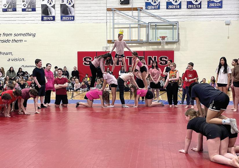 and tongue-in-cheek “patriarchy positions.” Continuing their narratives, the three houses faced off with their performances of group balancing pyramids on the gymnastics mats laid out on the floor. Kneeling on hands and knees, up to four older students created a base for smaller students to climb on top, building pyramids that would then collapse— following safe, tried-and-true techniques— to emphasize different parts of the storyline they were weaving. Some pyramids even crawled forward, demonstrating skill in working together. The houses each created their own configurations to bring life to their stories.