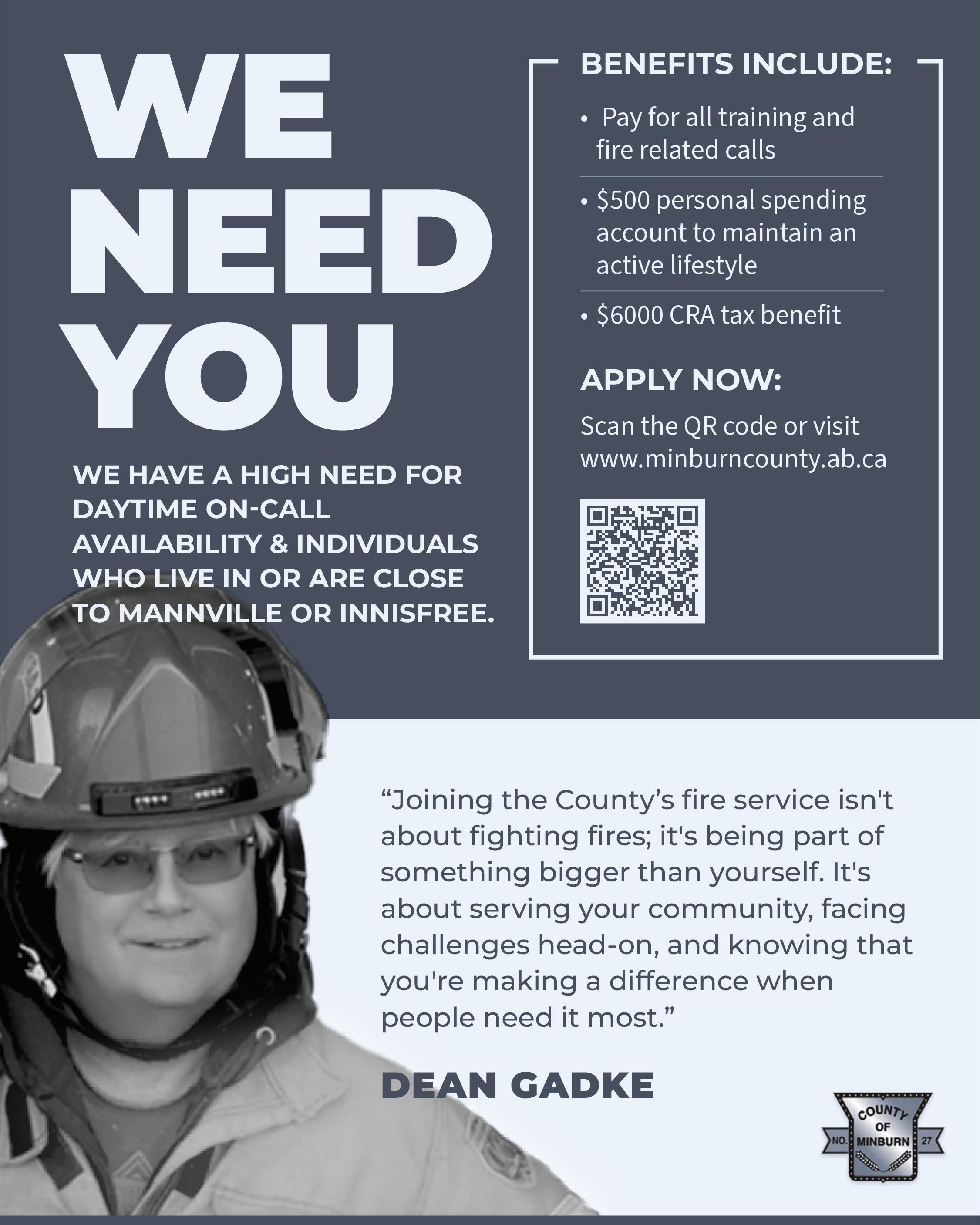 Volunteer Firefighter Recruitment: If you are interested in volunteering with one of our stations (Blackfoot, Clandonald, Dewberry, Islay, Kitscoty, Marwayne or Paradise Valley), please contact the County at fire@county24.com
