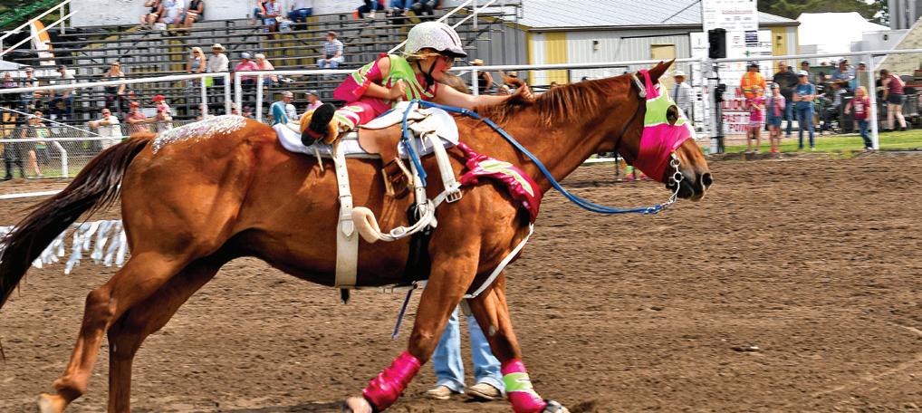 concession, the entertainment certainly delivered a thrilling start to the weekend. Saturday, July 26, focused on community spirit and local rodeo talent during the ever-popular Local Rodeo. Beginning at 12:30 p.m., this showcase brought out rural Alberta’s best amateur cowboys and cowgirls, offering a full afternoon of familyfriendly fun. For just $10 admission—and free entry for kids 12 and under—guests cheered on events like the Kids Muttin Bustin, Stick Horse Race, and the crowdfavourite Greased Pig Scramble. Children also showed off their skills in Calf Tying, PeeWee Barrels (no leading allowed!), and the Wild Pony Race.