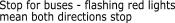 • Drivers travelling in both directions must stop for a school bus when the upper red lights are flashing, and the stop arm extended and must not proceed until the flashing lights have stopped.