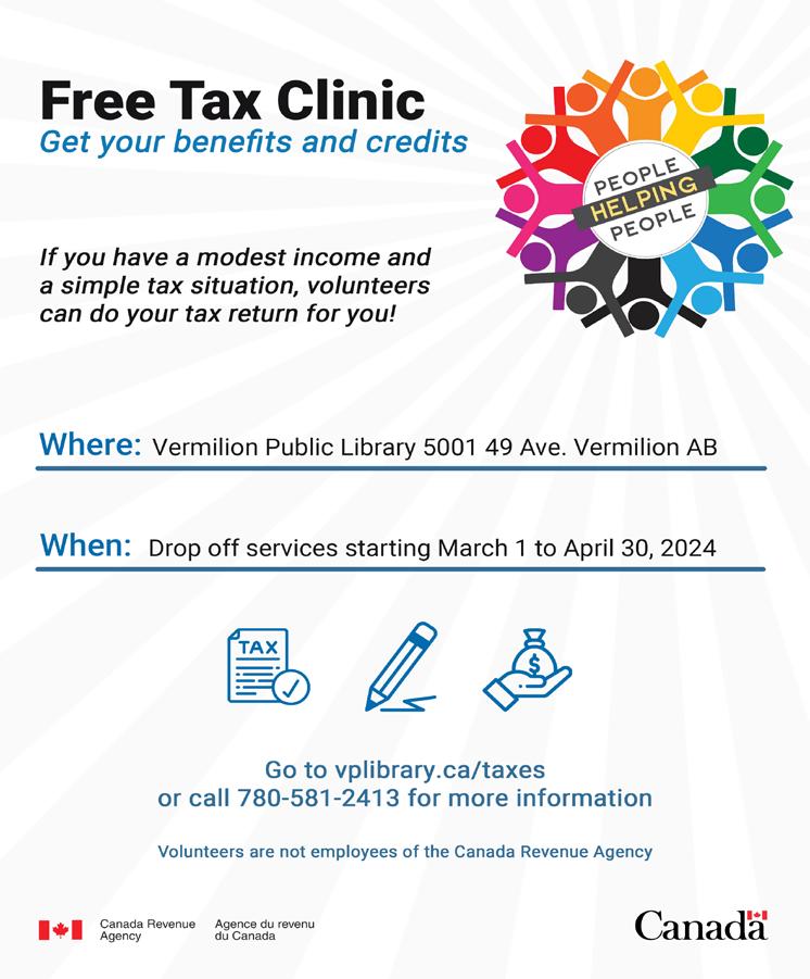 For March 2nd to April 27th there is a drop off service at the Vermilion Public Library. Each participant must complete and sign an intake formandprovide all required income slips. This is not a faceto-faceappointment service. Trained volunteers will complete tax returns for eligible individuals as per the information provided and call the individual when the return is completed and ready for pickup at the library. Don’t miss out on the benefits and credits you are entitled to. Take advantage of this free community service.For more information contact Vermilion FCSS at 780-581-2413.Individuals with a simple tax return can also call CRA directly at 1-800959-8281.