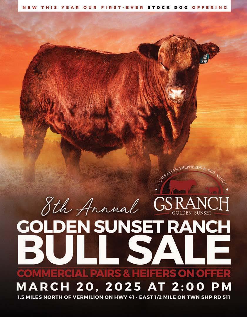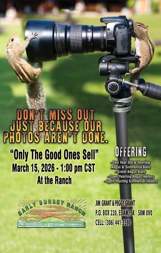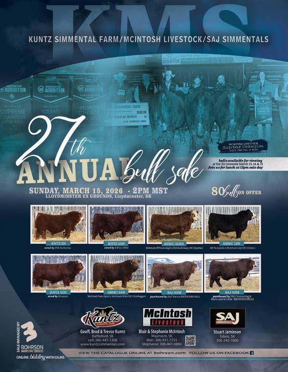 33rd ANNUAL ADAIR RANCH BULL SALE. March 18, 2026, Brownfield, AB. 37 Red and Black Simmentals, 8 Angus heifer bulls. Feed Efficiency Tested. Ken 403-575-5470.