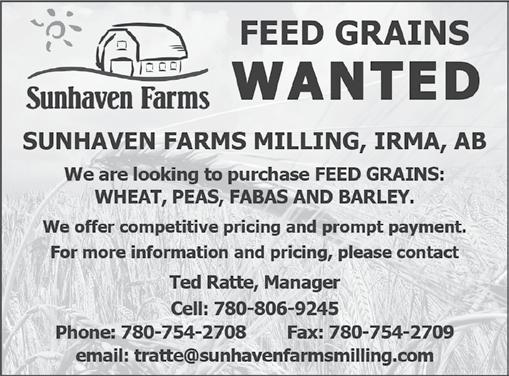 BARLEY – *NEW-AB Standswell* Smooth AWN, High Yielding, Grain and Forage Great Lodging Resistance. 1st NITROGEN USE EFFICIENT CEREAL IN CANADA.OTHER BARLEY: Cerveza, CDC Austenson, CDC Durango, CDC Maverick, Esma, Sundre. WHEAT – Pintail, Forage or Grain. OATS – AC Juniper, AC Morgan, AC Mustang, Derby, CDC S01 Super Oat. PEAS – Very Early Yellow Peas, Forage Peas. ALSO AVAILABLE: Polish Canola & Spring Triticale. Special pricing on truckloads. www.mastinseeds.com; 403-556-2609.
