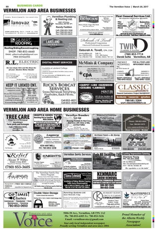 5006-50 Ave., Vermilion, AB T9X 1A2 Ph: 780-853-6305 Fx: 780-853-5426 Email: vermilionvoice@gmail.com Your only local independent newspaper. Proudly serving Vermilion and area since 2004.