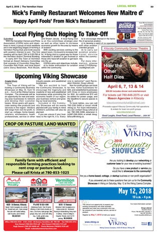 one is welcome!” said Recreation Director, Doug Lefsrud. Non-for-profit groups can book for free, home businesses for $35, and established businesses with three or more employees for $50. An additional $15 will be added for power usage, and the deadline to secure spaces is May 7. To book tables, you can call 780-336-3466 or email info@ viking.ca. For more information, you can contact Doug Lefsrud at (w): 780-336-3466, extension 4, (c)587-256-0524, or email: doug. lefsrud@viking.ca.