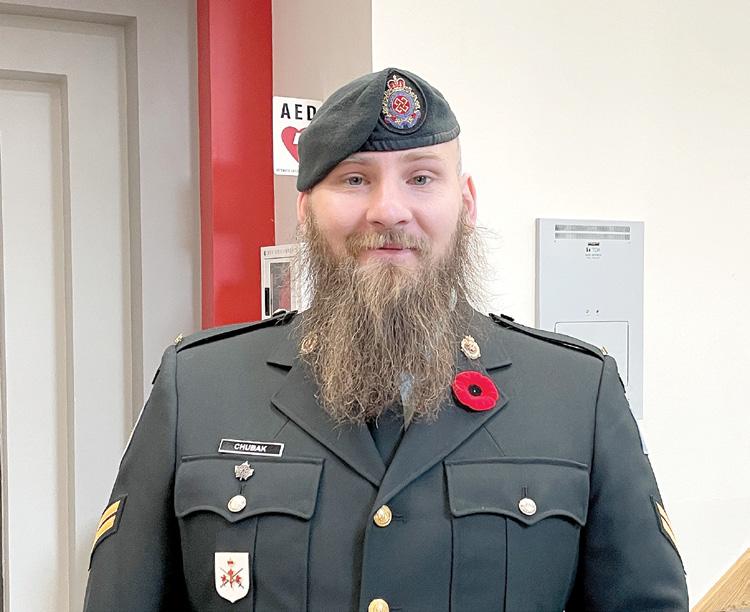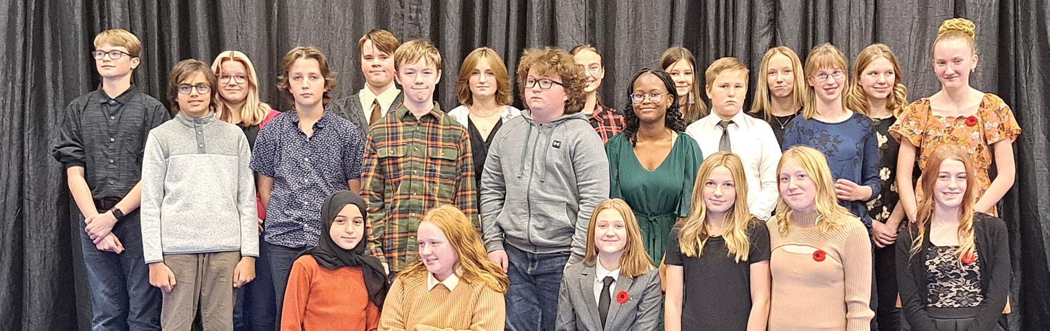We were honoured to be joined by Corporal Arie Chubak, an active solider stationed in Wainwright. It was incredible to listen to him define the word “honour” and hear him speak of his experiences serv ing our country, both good and bad. He spoke of comradery, courage, and hope. We were humbled by his strength and resilience. Thank you Cpl. Chubak for your service and your stories. The Grade 5 classes recited Canadian war doctor John McCrae’s famous poem “In Flanders Fields.” Class representatives came forward from Grades 1-12 to place wreaths at the front of the stage during the wreath laying portion of the ceremony. It felt like a bit of a historic moment as Mrs. Martin’s grade 4 class took the stage to perform, for the first time at our