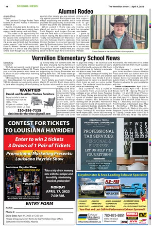 Date: April 11, 2023 at 12:00 pm Please bring your entry forms to the Vermilion Voice O ce. 5006 50th Ave Vermilion, Alberta MONDAY APRIL 17, 2023 7:30 P.M.