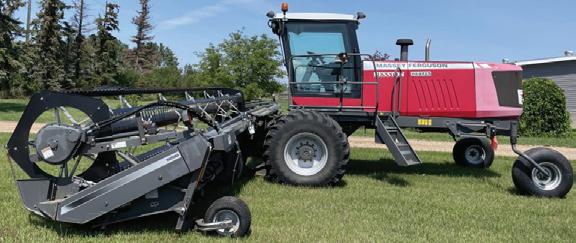 ●2012 MASSEY FERGUSON WR9725 s/p swather w/ 2013 MF 5200 header, 30 ft. UII p/u reel, 837 header hrs., 1,337 engine hrs., hyd. fore/aft, hydro, single knife drive, 1 owner.