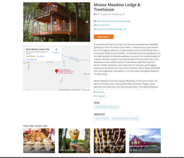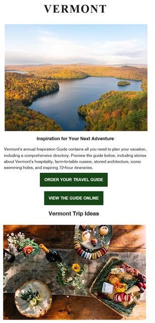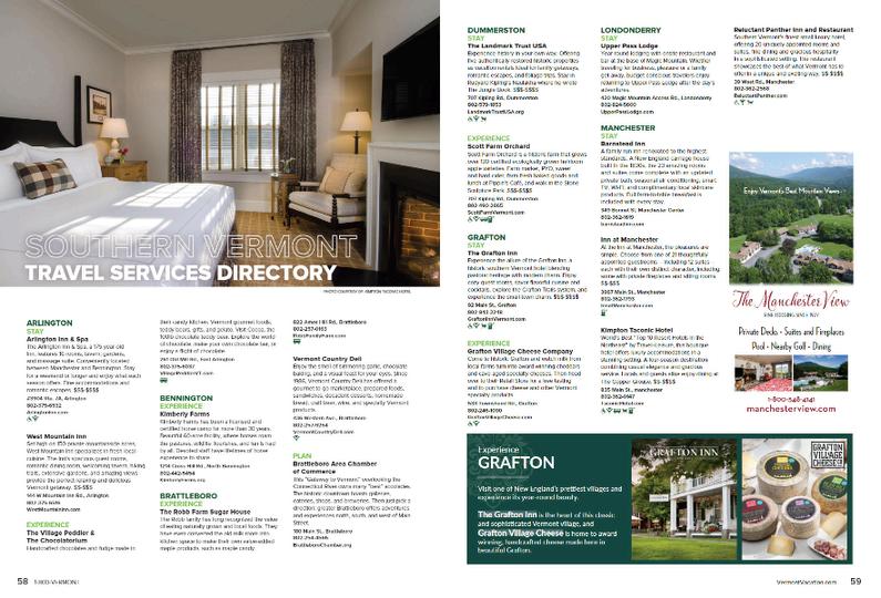 The most comprehensive offering within the Tourism Marketing Program All print display ads and the listing package include a print presence in the Annual Inspiration Guide and a featured listing on the VermontVacation com Stay & Play Directory