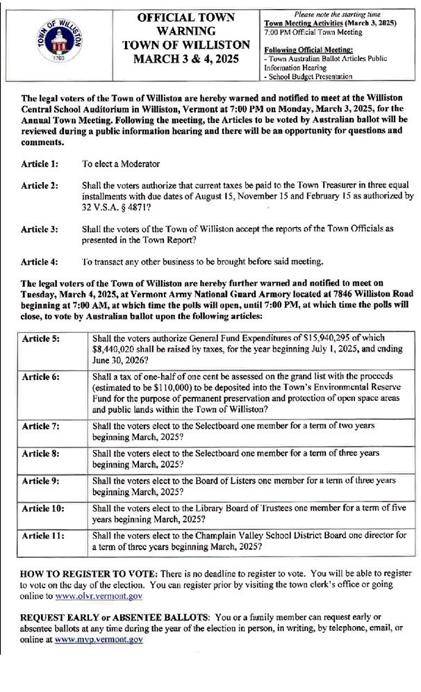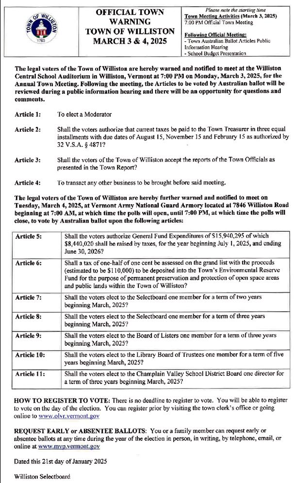 Mon., March 3—Williston Annual Town Meeting and budget presentation: 7 p.m., Williston Central School auditorium