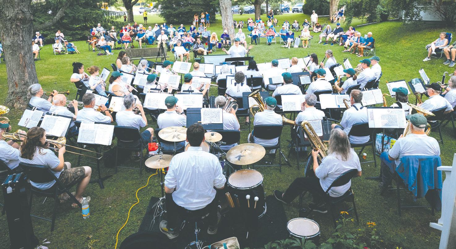 Since then, Schaw explained, the band has played from the grass in front of the bandstand. Some challenges related to this arrangement are chairs and music stands sinking into sometimes soft, wet ground.
